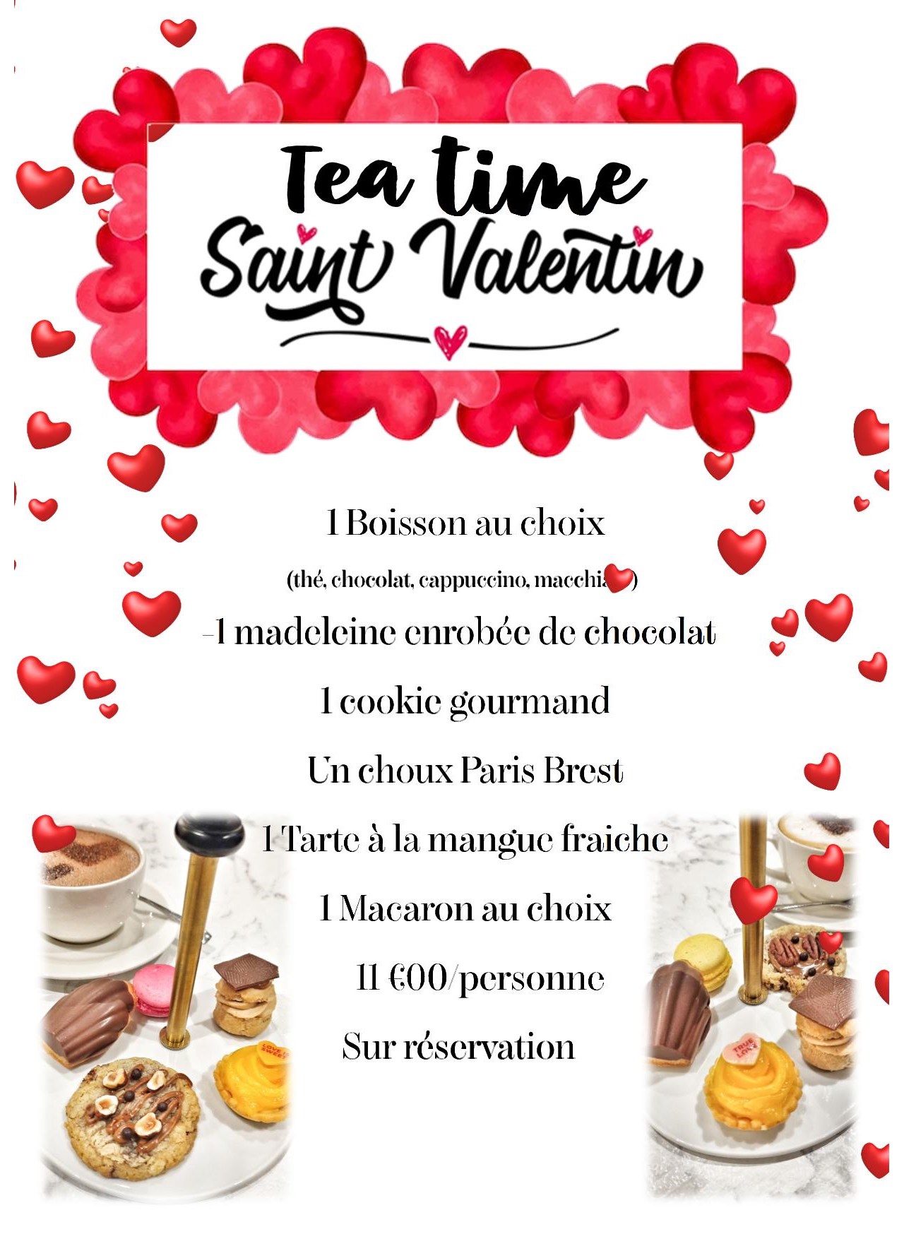 Ou installez-vous confortablement pour notre “Tea Time de la Saint-Valentin”, sur place, autour d’une boisson chaude et d’une sélection de petites douceurs sucrées, pensées pour être partagées à deux.